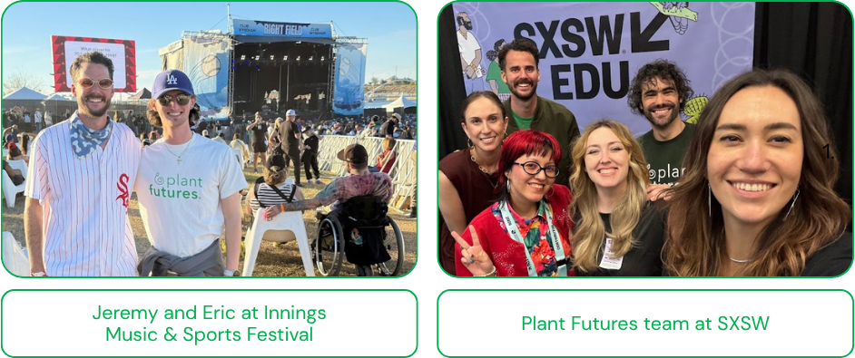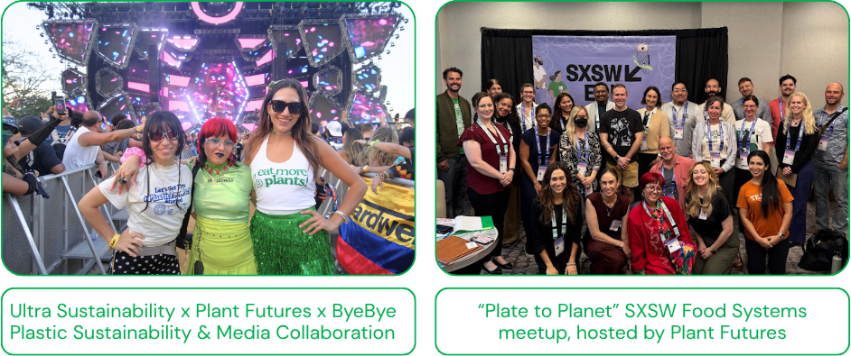 One of the biggest shifts in Q1 was Plant Futures’ expansion into major public arenas beyond campus. Through partnerships and appearances connected to SXSW, Ultra Music Festival, Okeechobee, Innings Festival, the Music Sustainability Alliance, the Music Sustainability Summit, and AVA Buenos Aires, the organization pushed food systems into wider conversations about sustainability, creativity, and cultural influence. Plant Futures also hosted its “Plate to Planet” meetup at SXSW and conducted more than 20 artist interviews across festival spaces, building new visibility with audiences in music, media, and the arts.